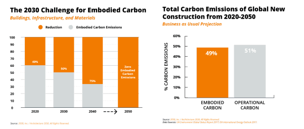 パリ協定で定められた目標を達成するためには、2030 年までにエンボディド カーボンを 50%削減し、2050 年までにエンボディド カーボンをなくす必要があります。